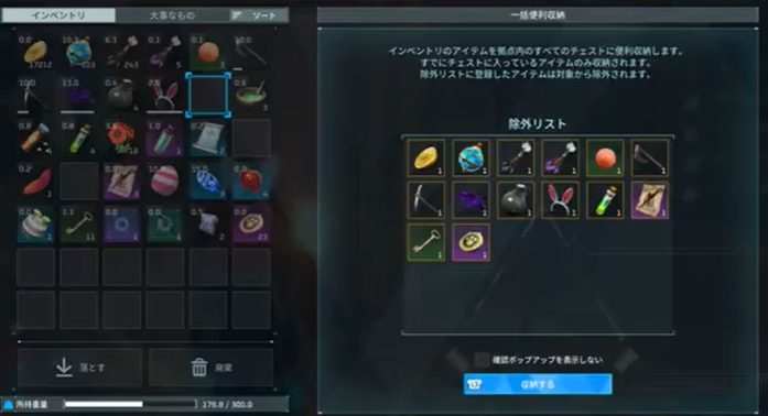 手持ちのアイテムを、拠点内のチェストに一括で収納できます。
